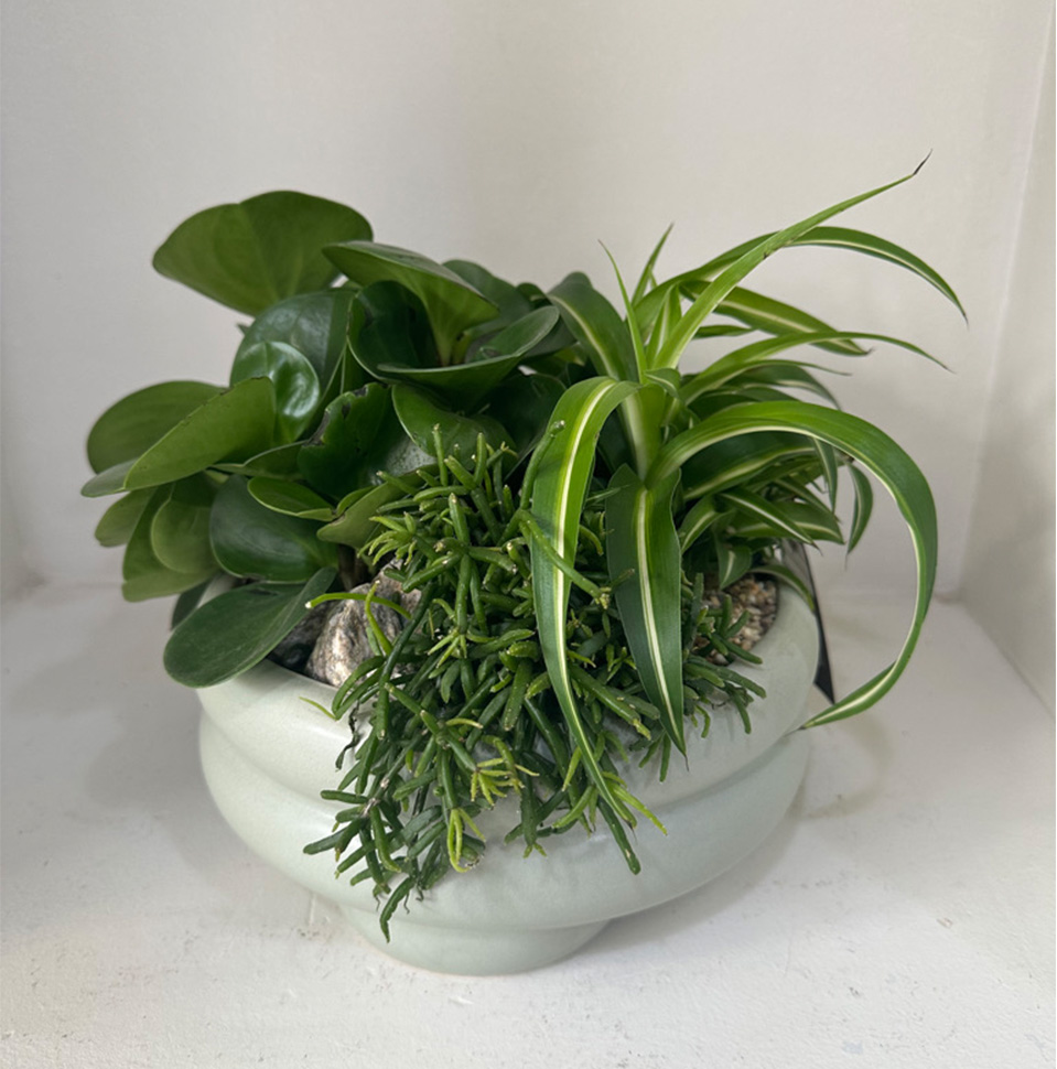 Σύνθεση σε πήλινο κασπώ που αποτελείται από τα εξής παχύφυτα: χλωρόφυτο, rhipsalis και πεπερόμια.