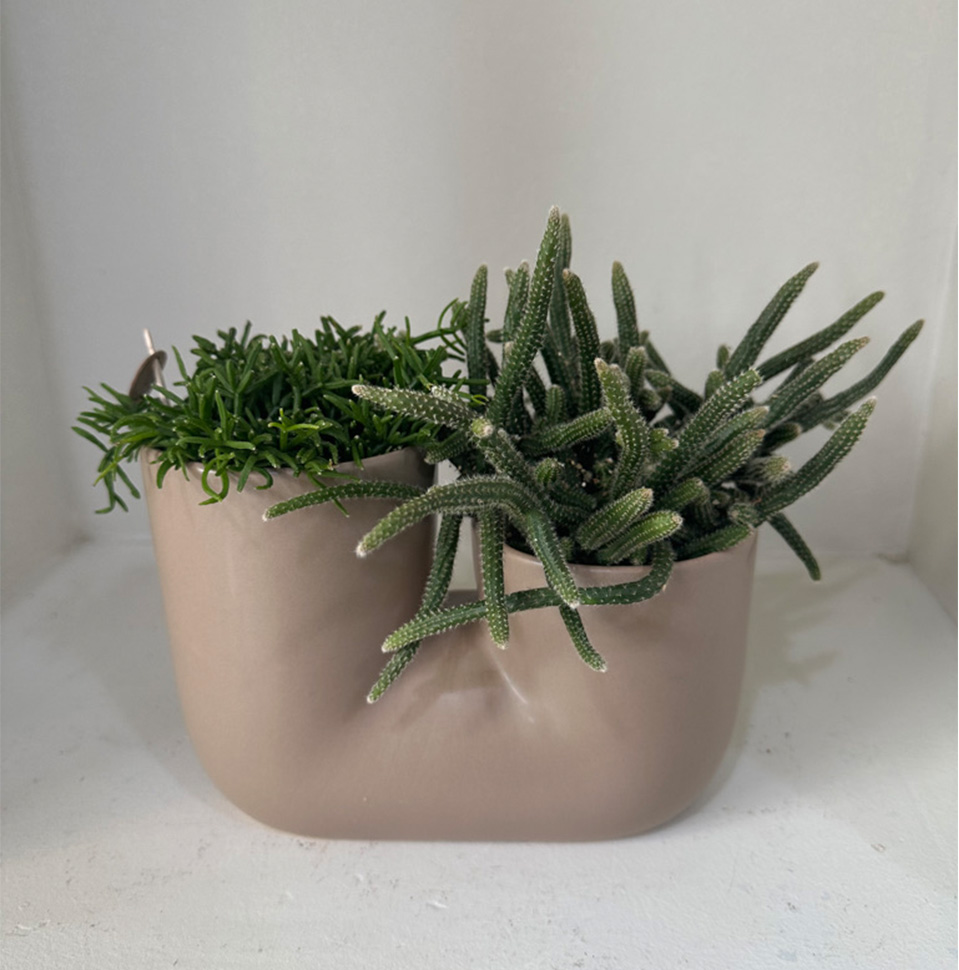 Σύνθεση σε εντυπωσιακό πήλινο κασπώ που αποτελείται από rhipsalis και baccifera. Ανθεκτικά παχύφυτα που δεν χρειάζονται ιδιαίτερη φροντίδα.