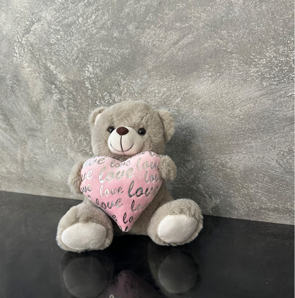 Αρκουδάκι σε γκρι χρώμα με love λογότυπο σε ασημί χρώμα.